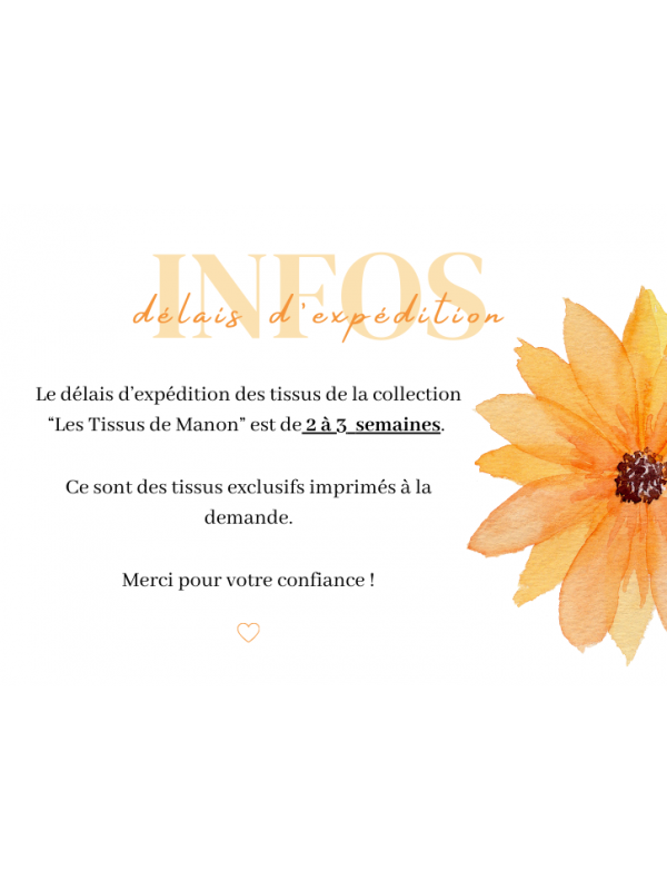 ATTENTION, les tissus de la collection "Les Tissus de Manon" sont vendus en précommande, le délais d'expédition est de 2 à 3 semaines.