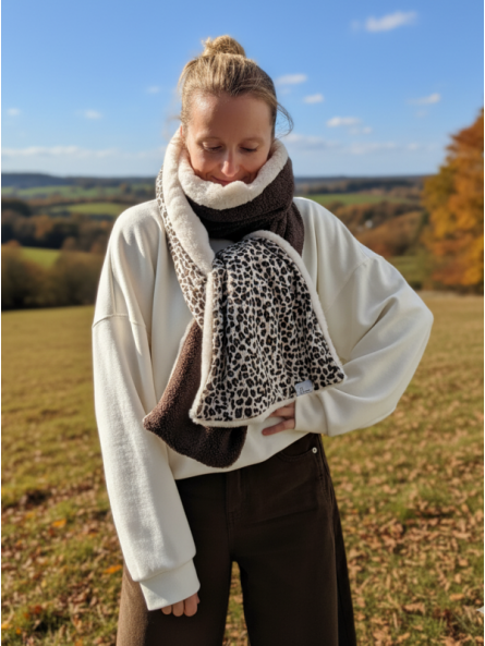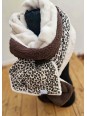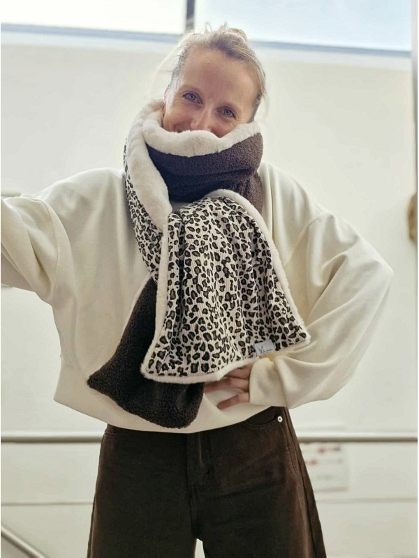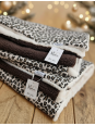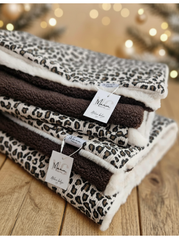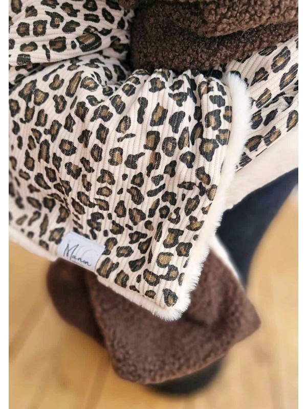 Elle est composée d'une face en tissu léopard + tissu doré et l'autre face en fausse fourrure ultra-douce couleur blanc cassé/sable.