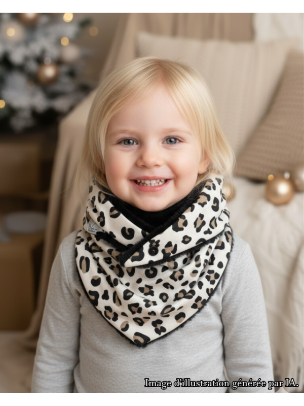 Foulard triangle bien chaud et épais ! Il peut se porter dès 2-3ans en faisant un petit noeud et jusqu'à 10ans.