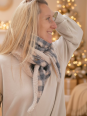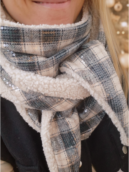 Pour celles qui préfèrent un foulard moins épais que les grands triangles. Le tissu à carreaux est muni de sequins pour un effet scintillant !