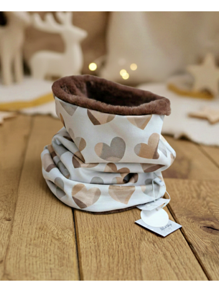 Snood en tissu jersey à motifs coeurs, doublé en fausse fourrure ultra-douce brune.