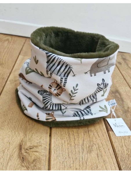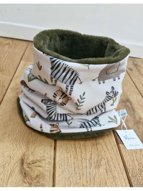 Snood en tissu jersey animaux, doublé en fausse fourrure ultra-douce kaki.